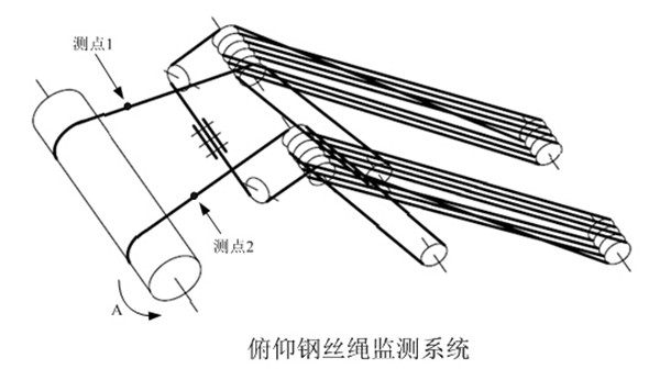 俯仰老司机黄色激情视频係統2個測點布置在卷揚機出繩口附近,這樣布置可以監測整根老司机黄色激情视频載荷和彎曲疲勞嚴重的部分。當卷揚機如圖示A方向運動時(即拉起前伸梁懸臂時)磁化與探測同時進行。