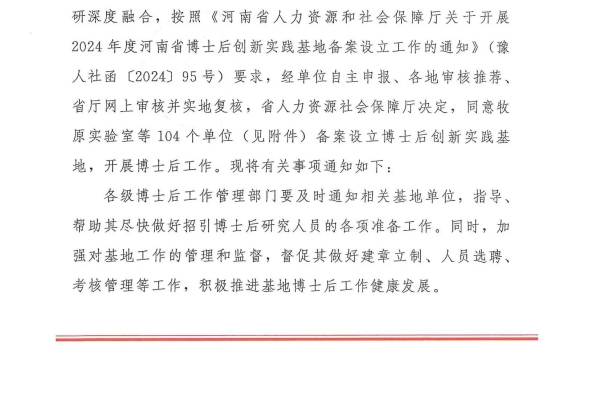 10月8日,河南省人力資源和社會保障廳印發《關於同意牧原實驗室等104個單位備案設立博士後創新實踐基地的通知》,洛陽老司机黄色视频探傷技術有限公司獲批設立河南省博士後創新實踐基地,標誌著我司科研創新和高層次人才隊伍建設工作邁上新台階。